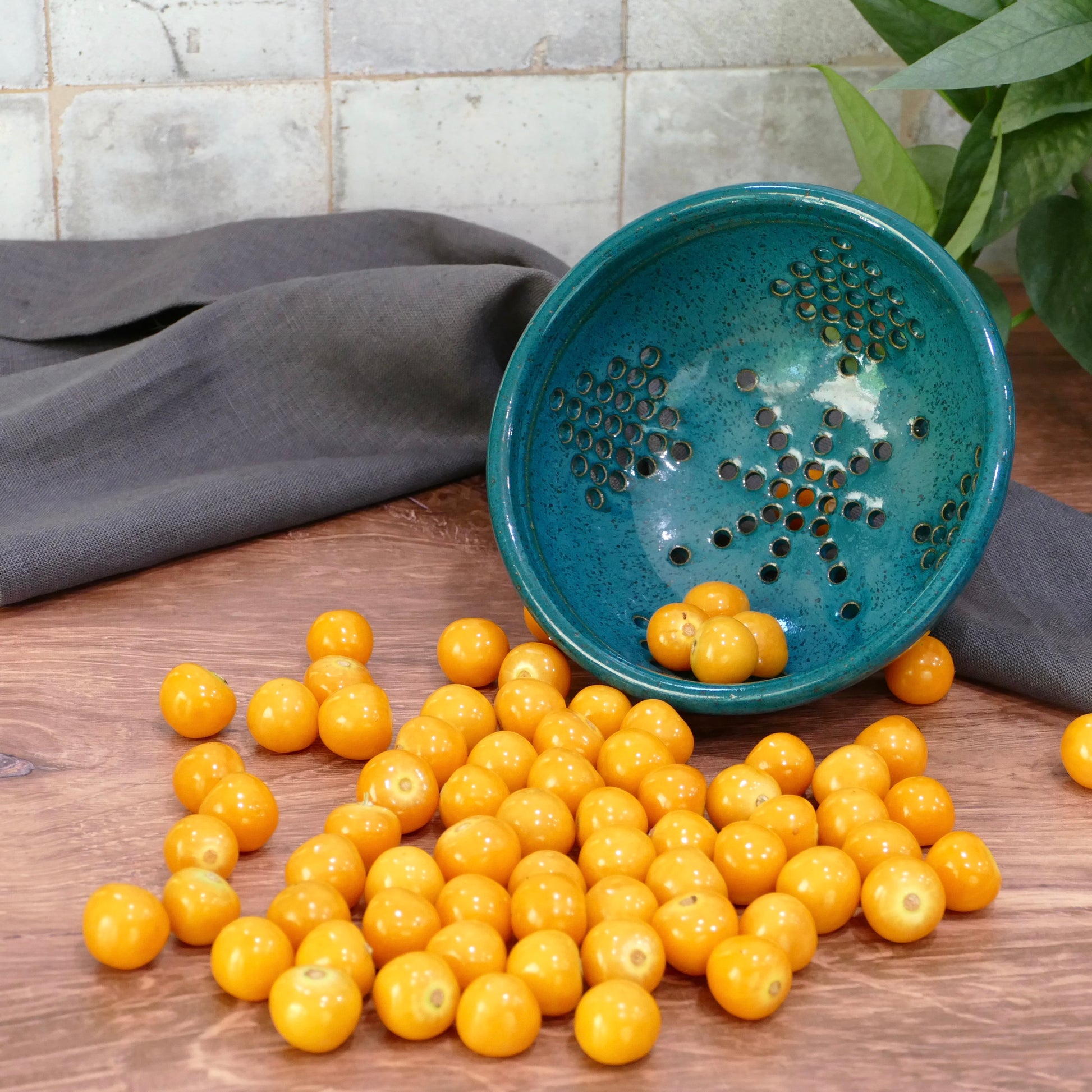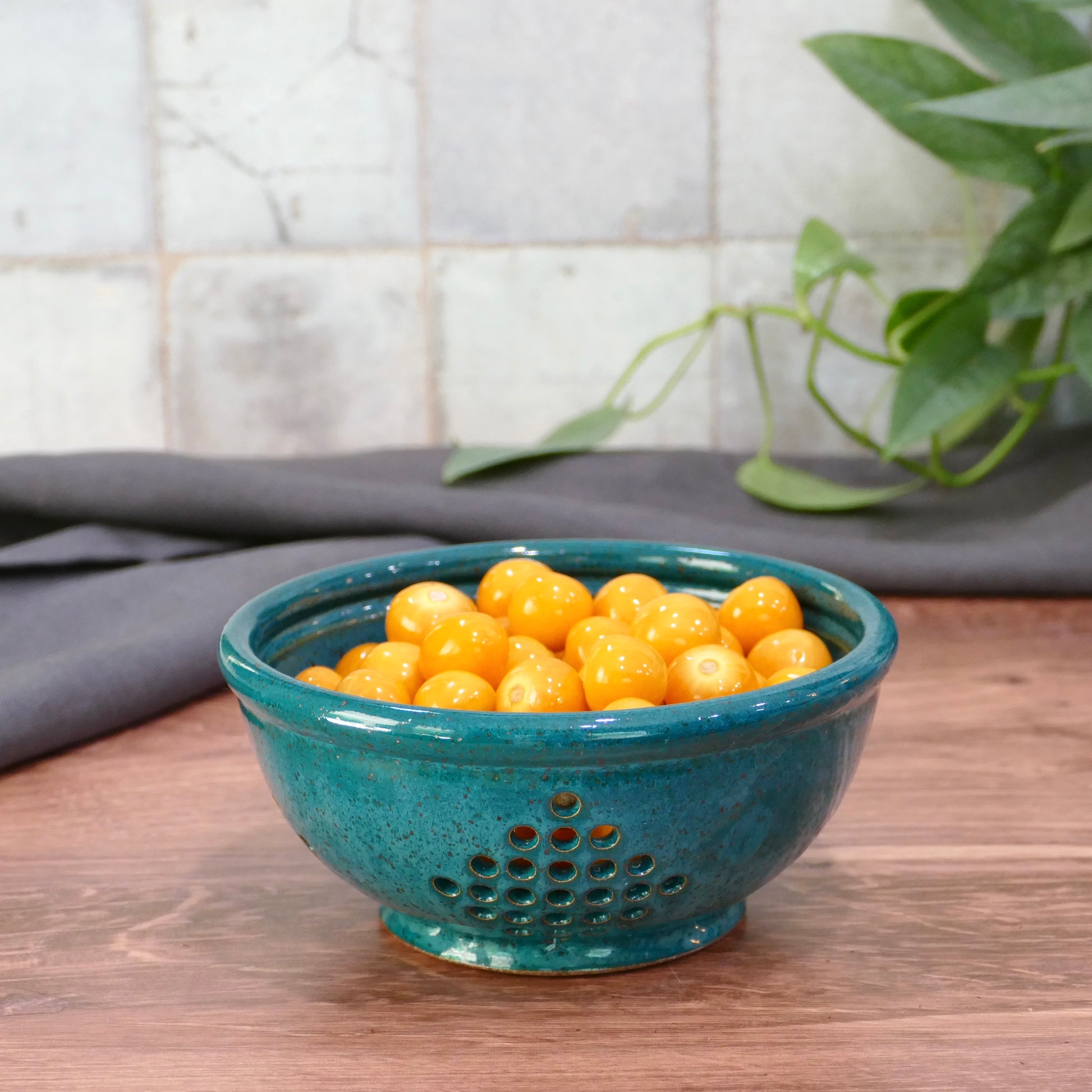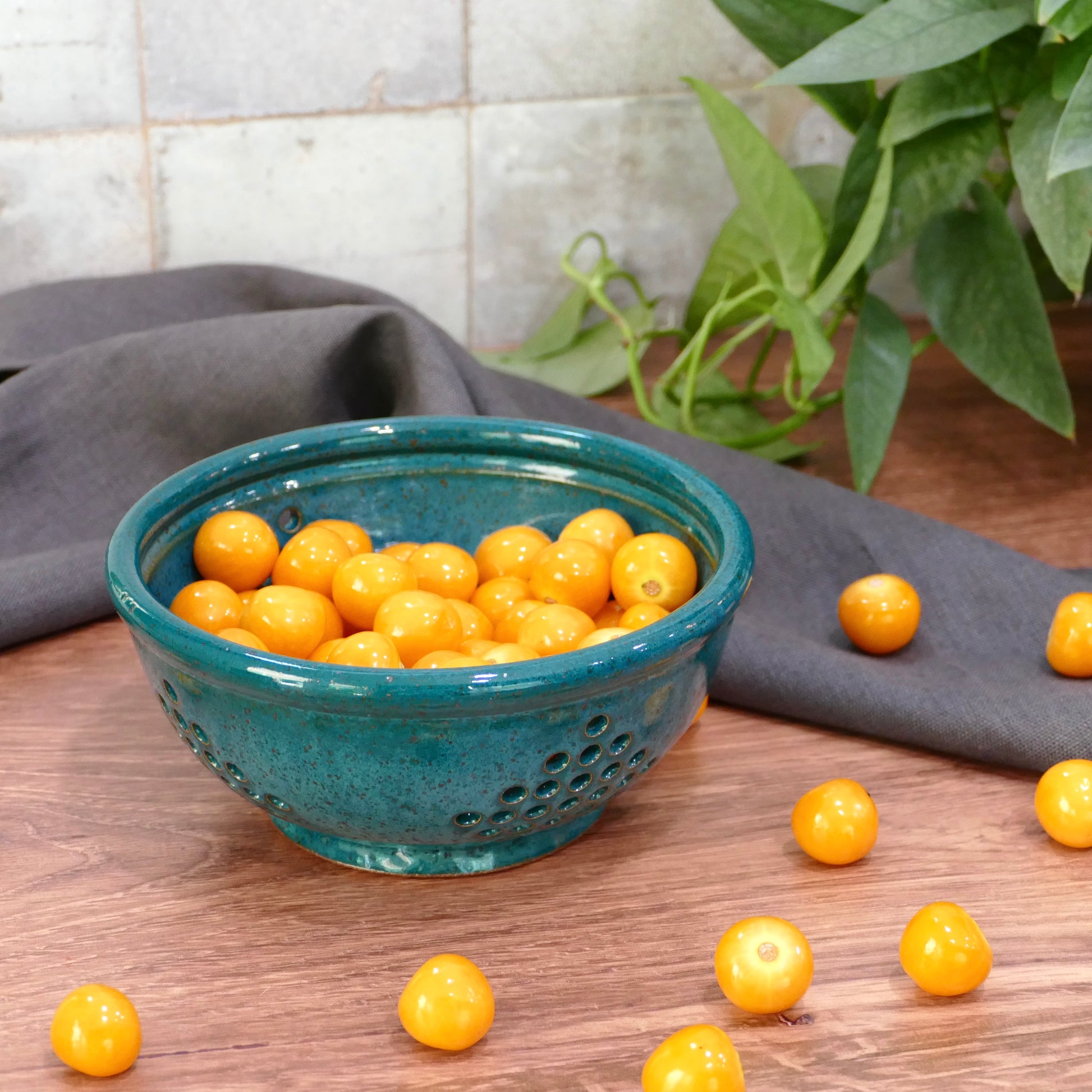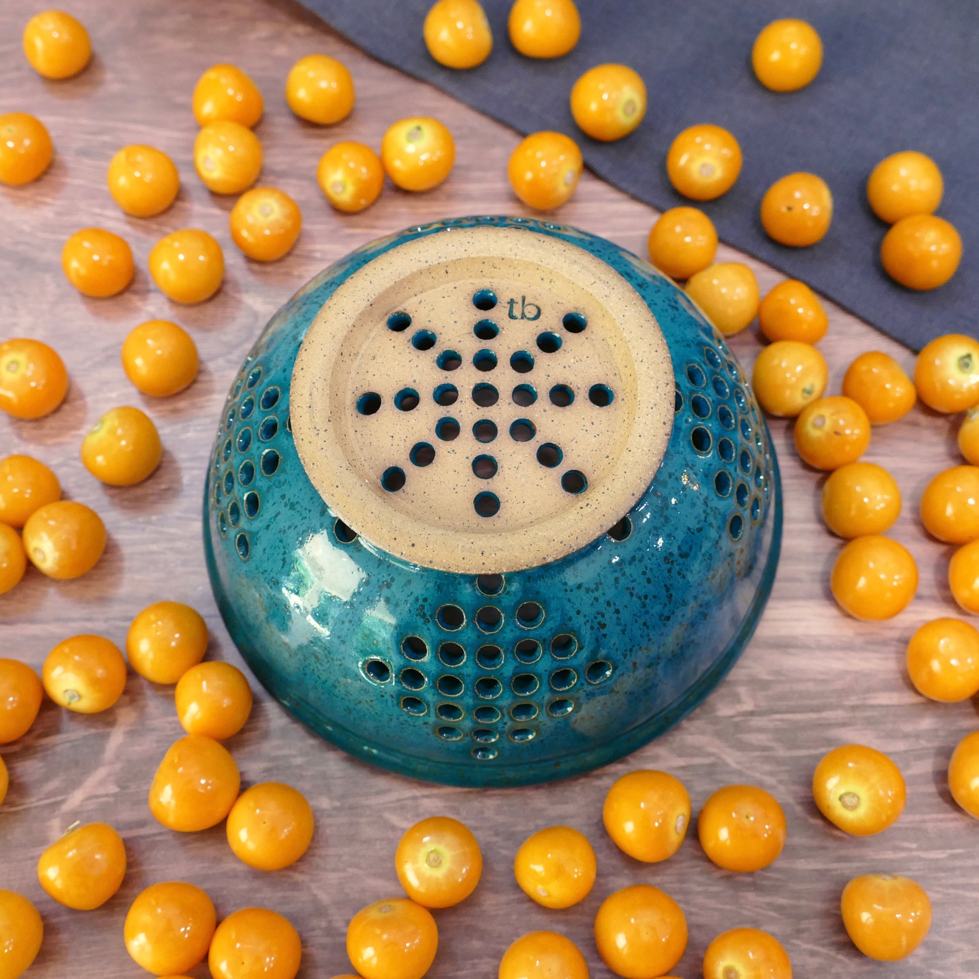 This berry bowl was made by hand in my small studio in North Carolina. Each hole was individually poked and smoothed out by hand. It is just the right size for holding and rinsing a small carton of fresh blueberries, raspberries, blackberries, or other small fruits and veggies. It has plenty of drainage holes and is dishwasher safe, so cleanup is simple. The glaze is a food-safe glossy dark cyan.