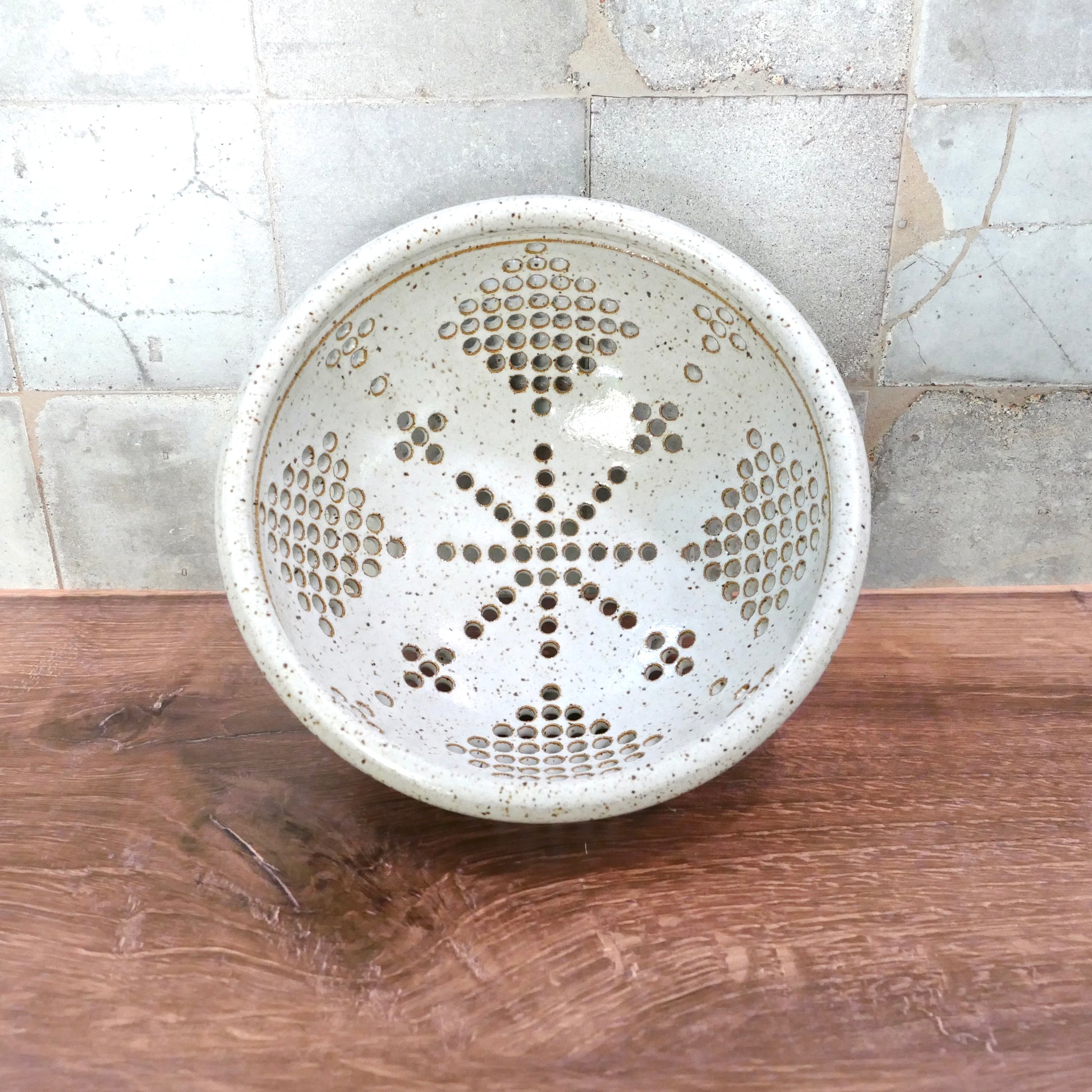 This piece is different from the usual Classic Colander in speckled white because it was fired to a higher temperature, giving it more speckles and a slightly darker tint.